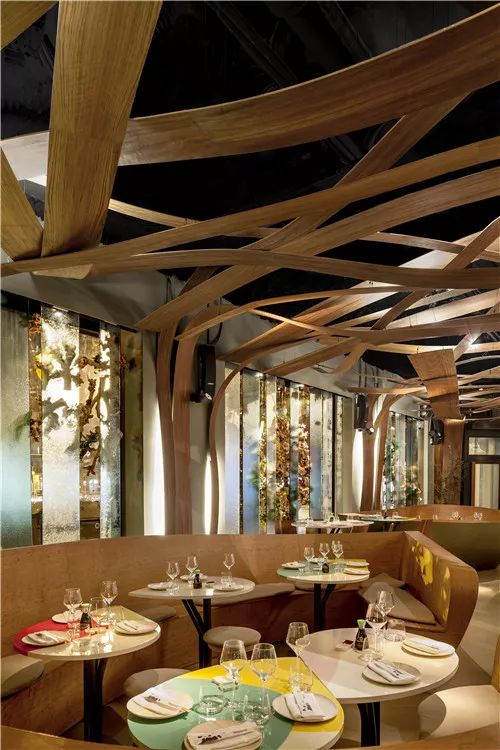 櫥窗里的植物起到了窗簾的作用,在分散光線的同時,連接室內與街道的視覺,創造出更加舒適的空間。屋頂由彎曲的樹枝構成,在每一個面上都投射出溫暖的光影。