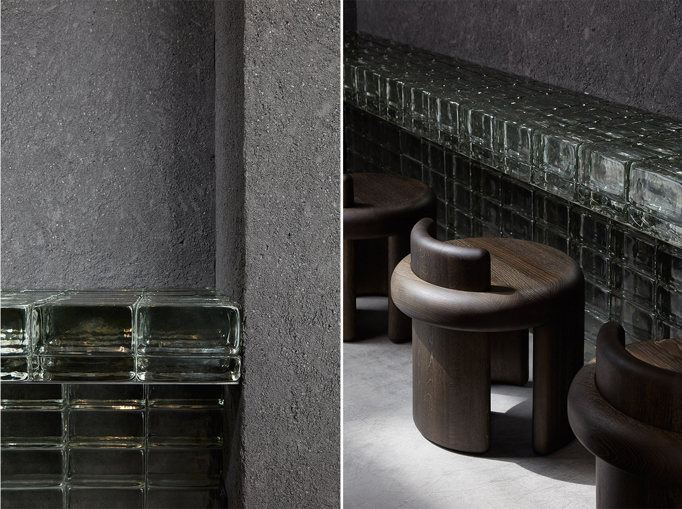 值得一提的是,以深灰為主色的堅實店立面由夯土、粘土和玻璃磚制成,喚起了人們的探索欲,旨在吸引人們進入并飽餐一頓。此外,通往餐廳區的狹窄入口是為了控制主餐廳的自然光強度而設計。這里面設有一片再次呼應日本地下壽司店氛圍的昏暗區域。