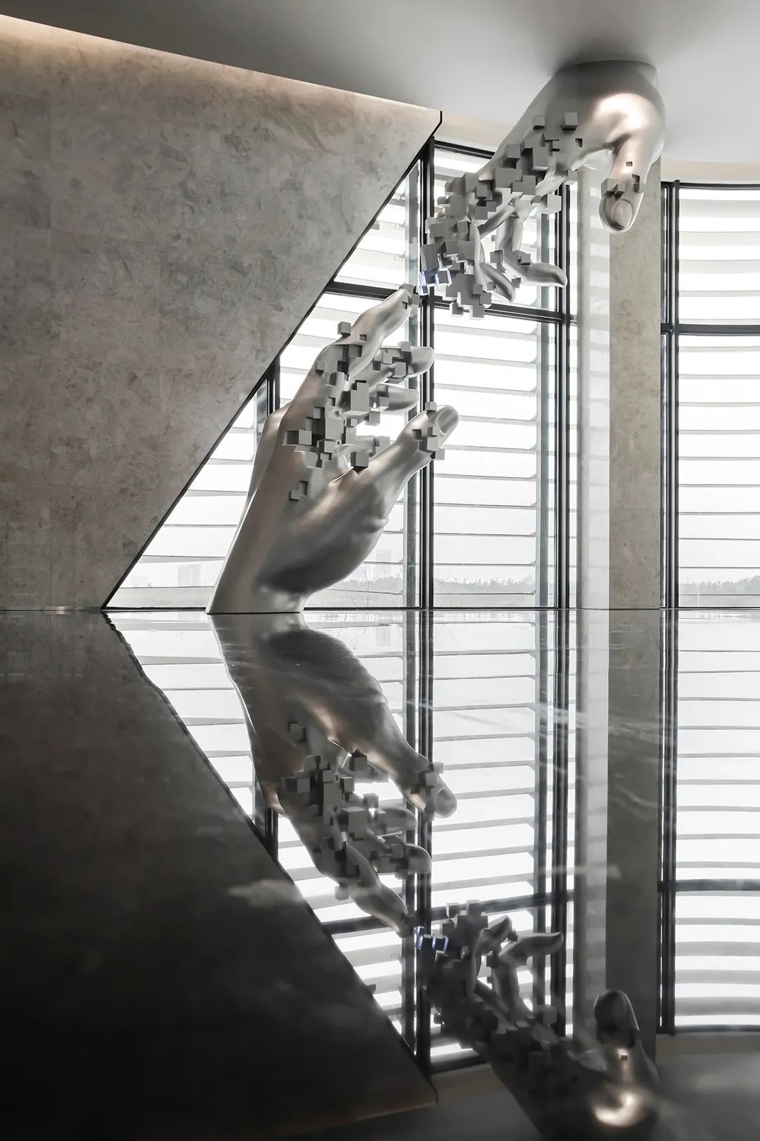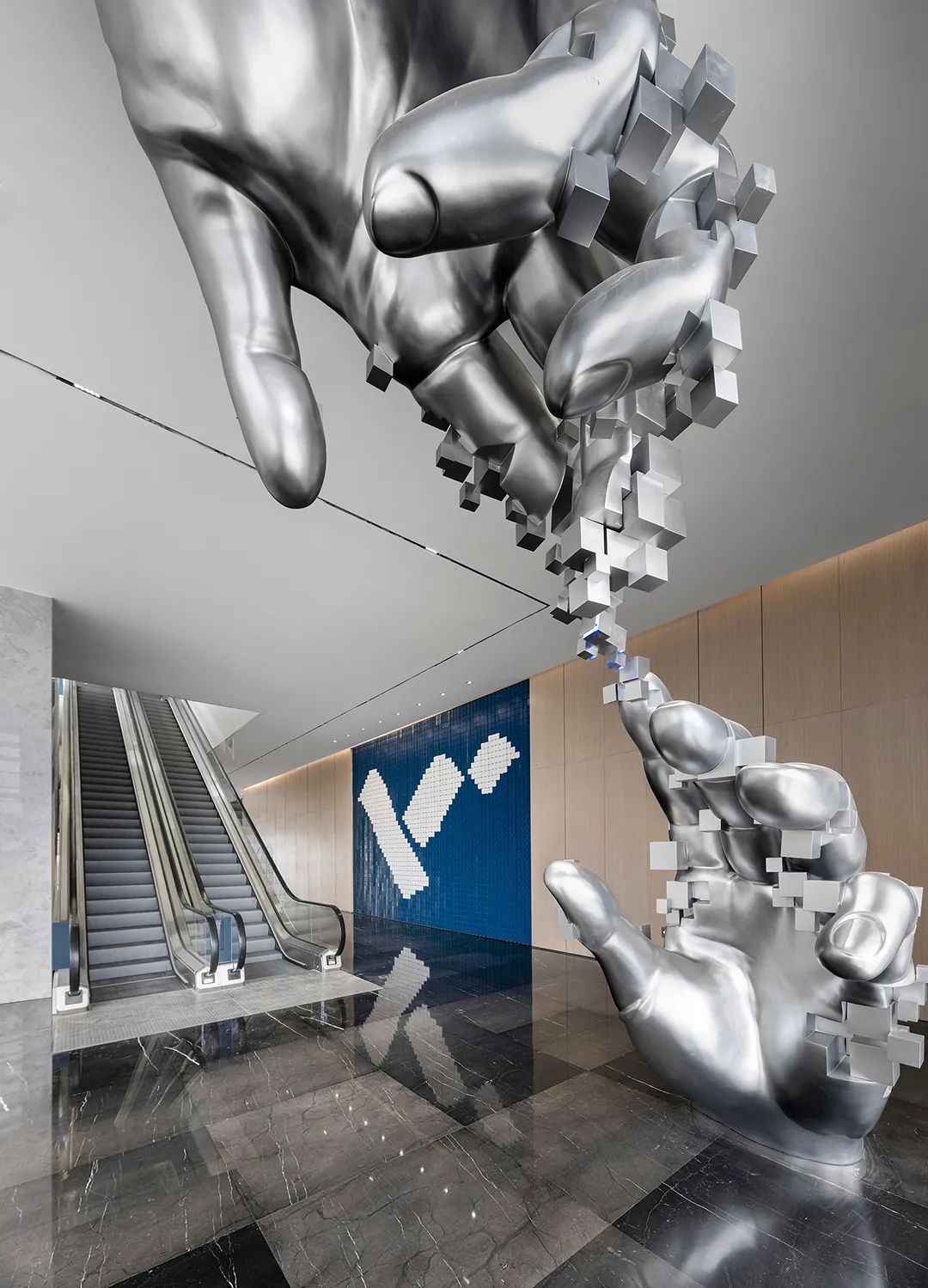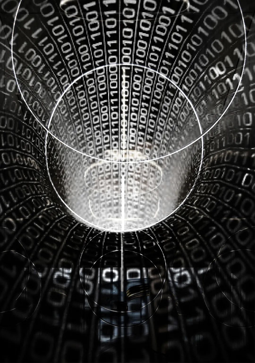 經過陣列燈光環形裝置,仿佛穿過如光纖一般的時光隧道,遇見人與科技共生的未來 —— 西斯廷教堂天頂壁畫《創世紀》里那兩只將要觸碰的、要帶人進入新紀元的手。