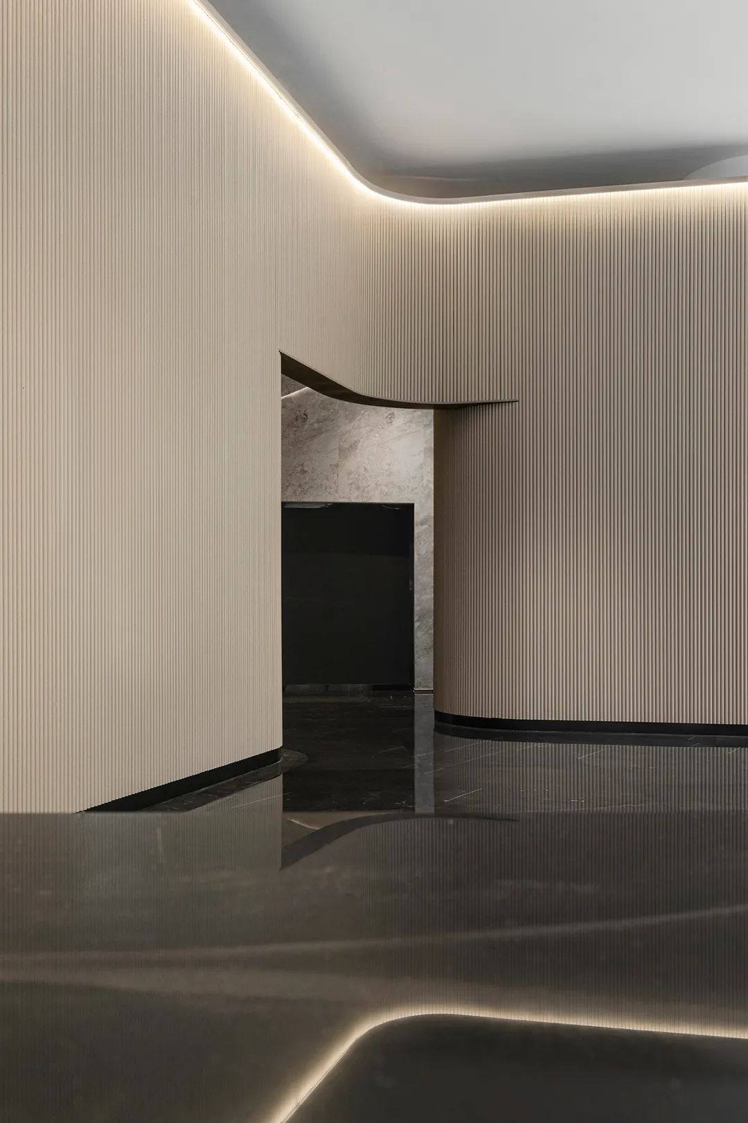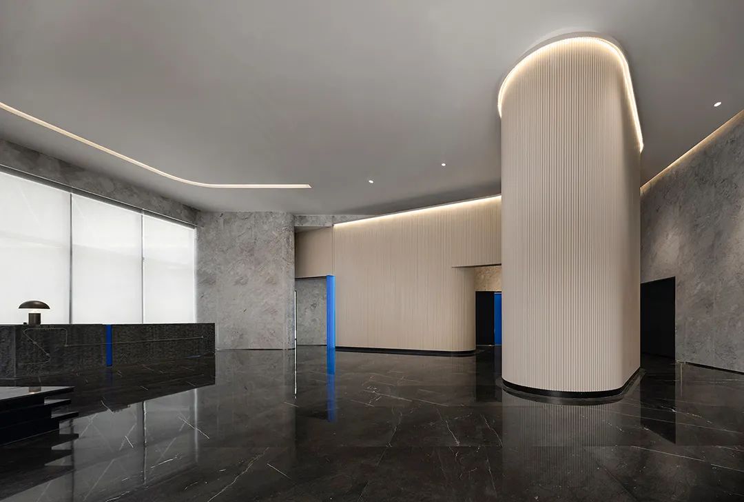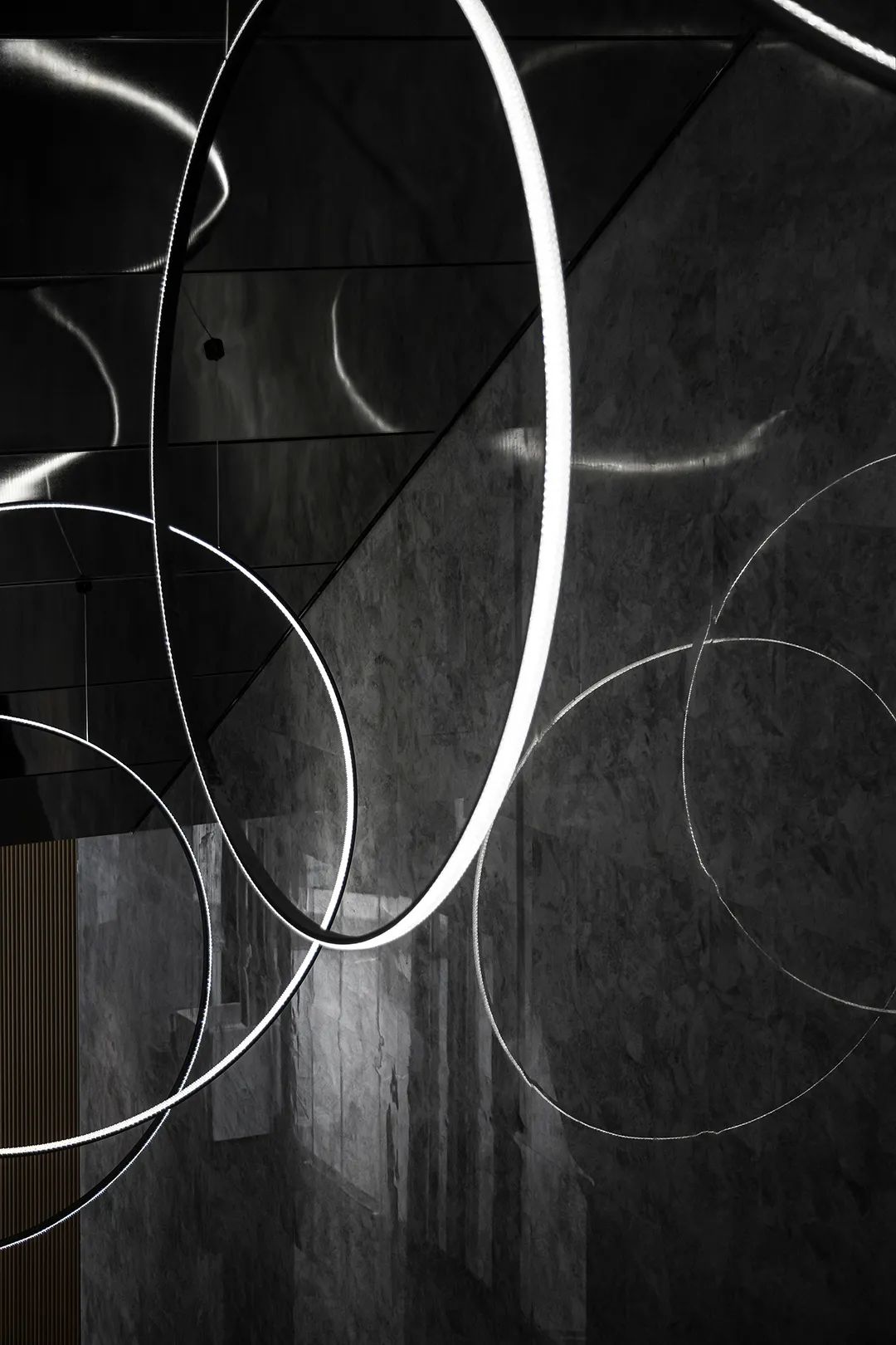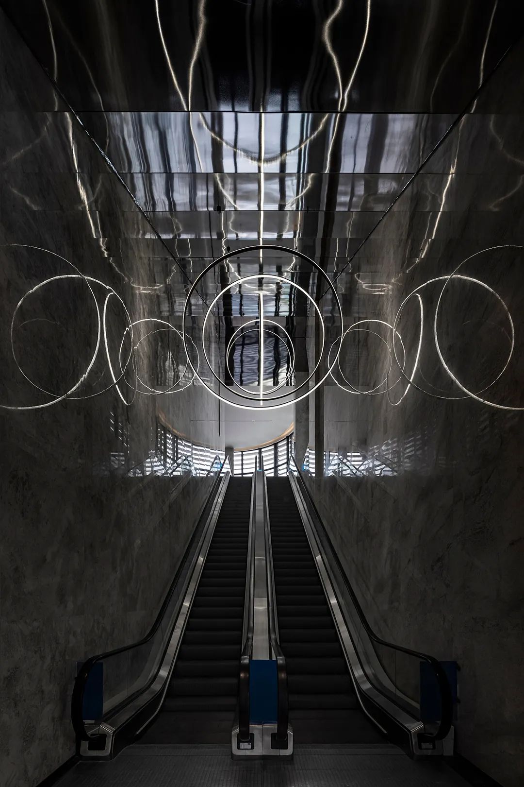 設計師在狹長的空間條件上,以陣列式圓形光環裝置作為視覺的重心,在光影的層次中,勾勒出一條神秘莫測的“時空隧道”,指向于未來感與科技感的外化表現。當來訪者循道而上時,仿佛穿過時空交疊的光暈,同時漫步于當下與未來,在幾何形制交織出的動態路線中,感知著空間多重維度的哲思。