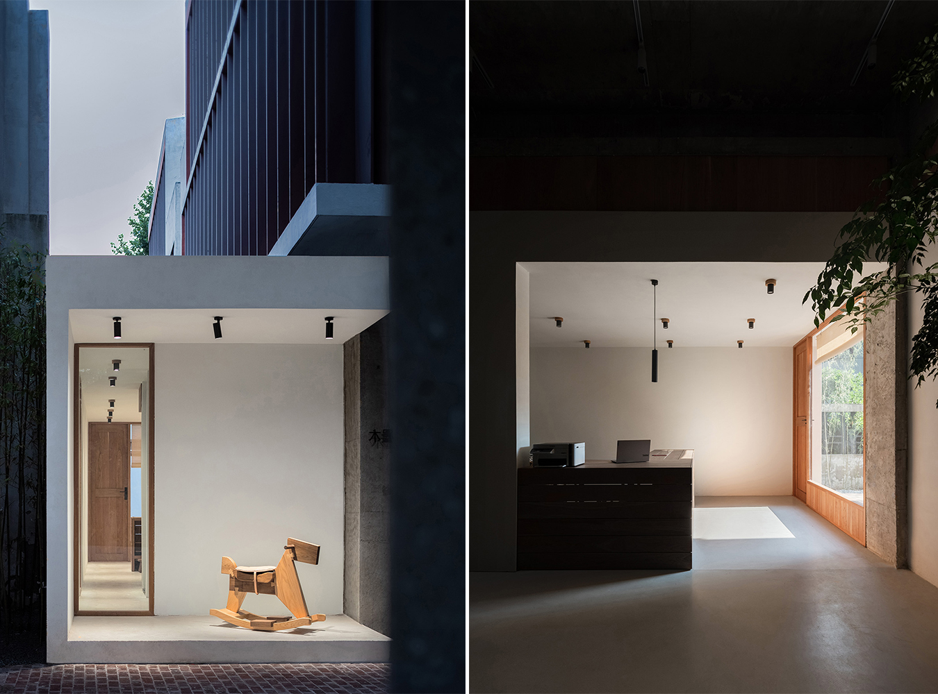 項(xiàng)目的位置正是這棟老樓首層的一側(cè)沿街空間。嚴(yán)格來說,這不是一棟完整的老樓,早期是民國時(shí)期江南造幣廠的車間,園區(qū)改造時(shí),新建一棟辦公樓在其內(nèi)部,只剩下幾片高聳的紅色磚墻,延續(xù)著它的前世今生。紅色磚墻上的窗洞著聯(lián)系內(nèi)外兩側(cè)的風(fēng)景,外側(cè)是城市,內(nèi)側(cè)的當(dāng)代建筑脫開磚墻而立,其間的空隙自然形成過渡空間。