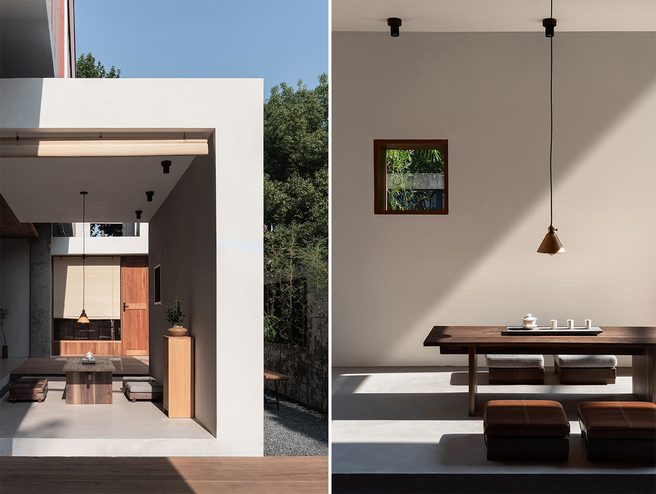 在內(nèi)部庭院,室內(nèi)的原木吊頂向庭院延伸,新的立面退后消隱,室內(nèi)外空間融為一體。C字形茶座坐落于院中,對(duì)外部的城市環(huán)境進(jìn)行局部的限定,通透的空間因此多了一分內(nèi)向。