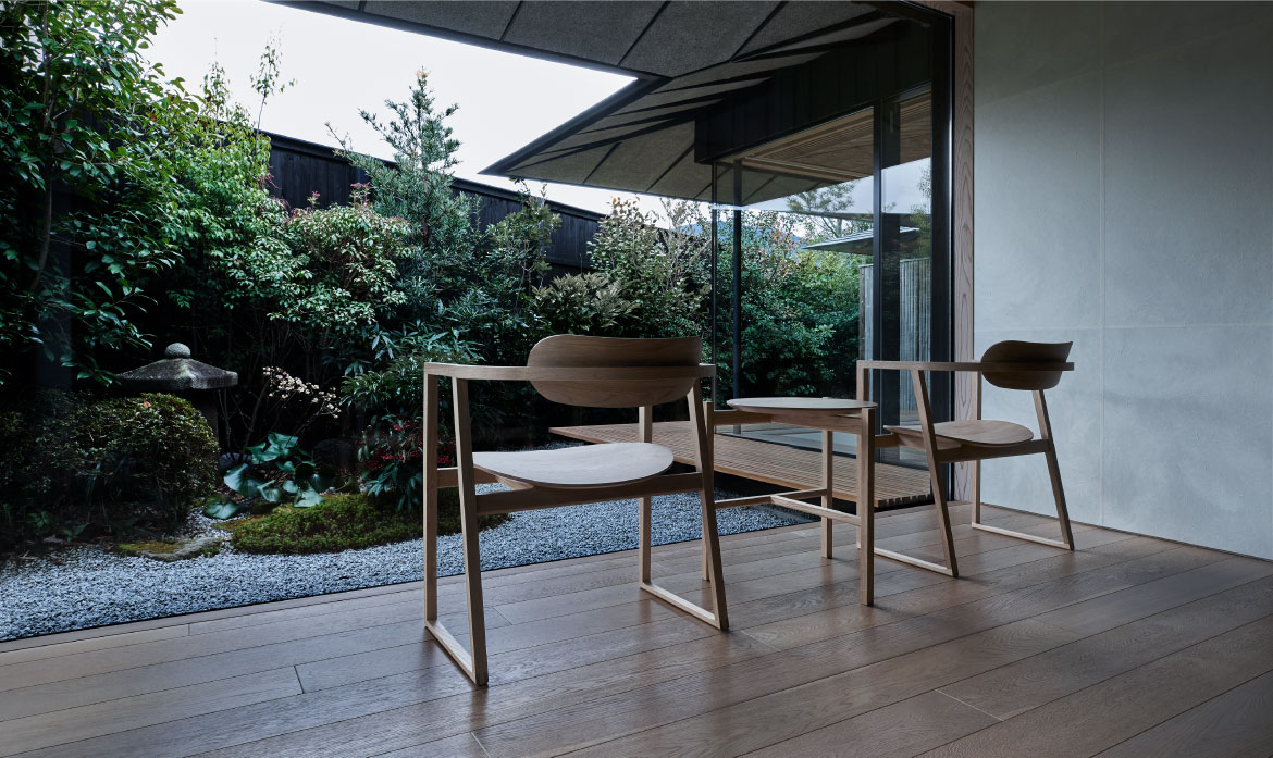 使用國產小徑木的部件細長且堅韌,構成要素控制在必要的最低限度。另外,將經過縝密計算的座面和背板配置成絕妙的彎曲和角度,雖然很小,但卻能讓人有安定感。在簡潔的設計中具有超群的功能性,是以和的空間原點為目標的家具系列。