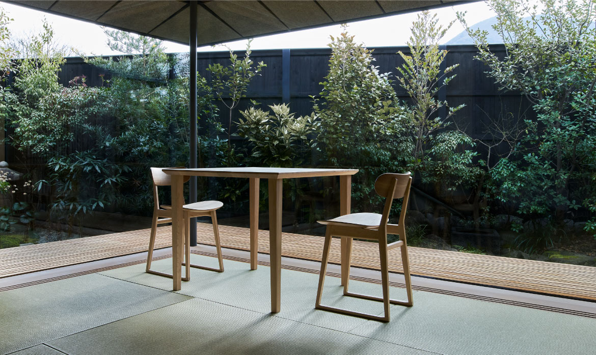 在日本的空間里心情舒暢地收納的椅子的陣容。名字也叫“SUWARI(坐)”。無論是木頭、榻榻米、地毯,都是不會給地板造成負擔的腳的構造,是將所有“坐”的活動變成舒適風景的家具。