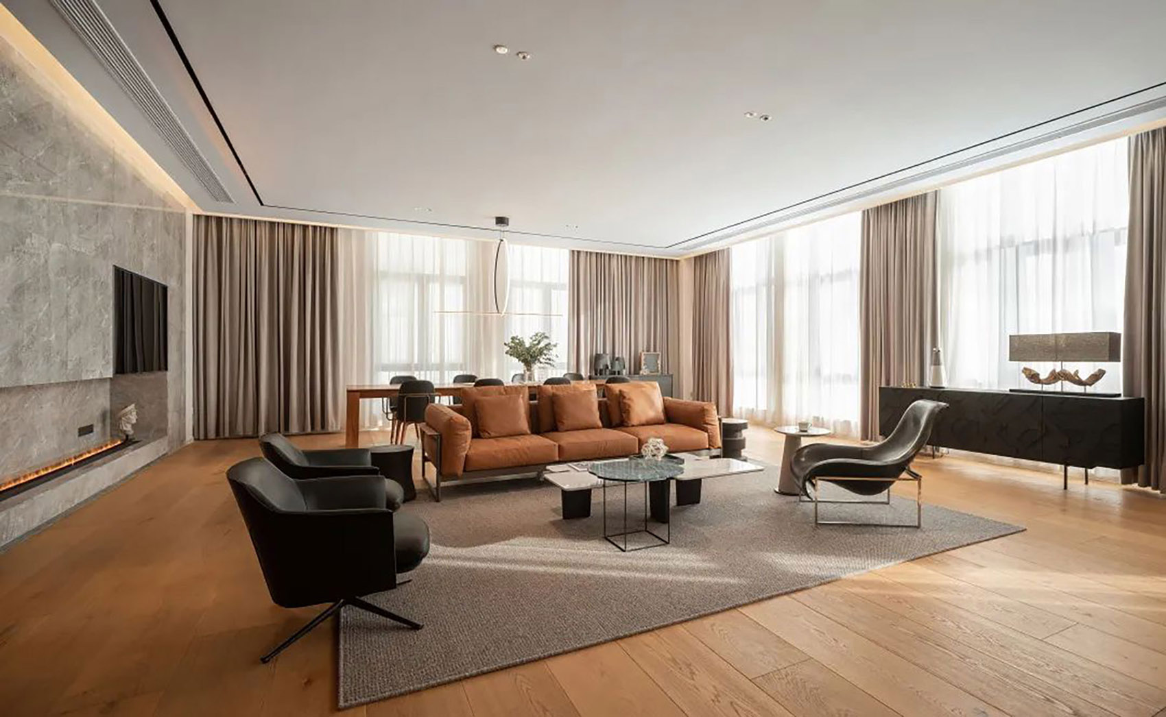 總經(jīng)理辦公室,以黑色和橘棕色的家具為主,灰色大理石墻面精致而冷峻,LED仿真壁爐增添了幾分溫暖和閑適,通過材質(zhì)的運(yùn)用和軟裝搭配讓空間兼具時(shí)尚與質(zhì)感。不管繁雜的工作如何變化,都能讓公司有機(jī)地不斷向上成長。