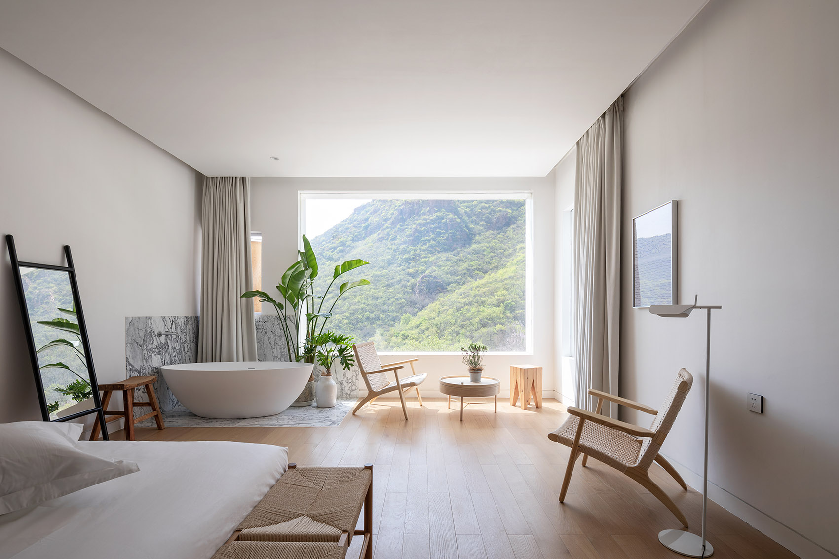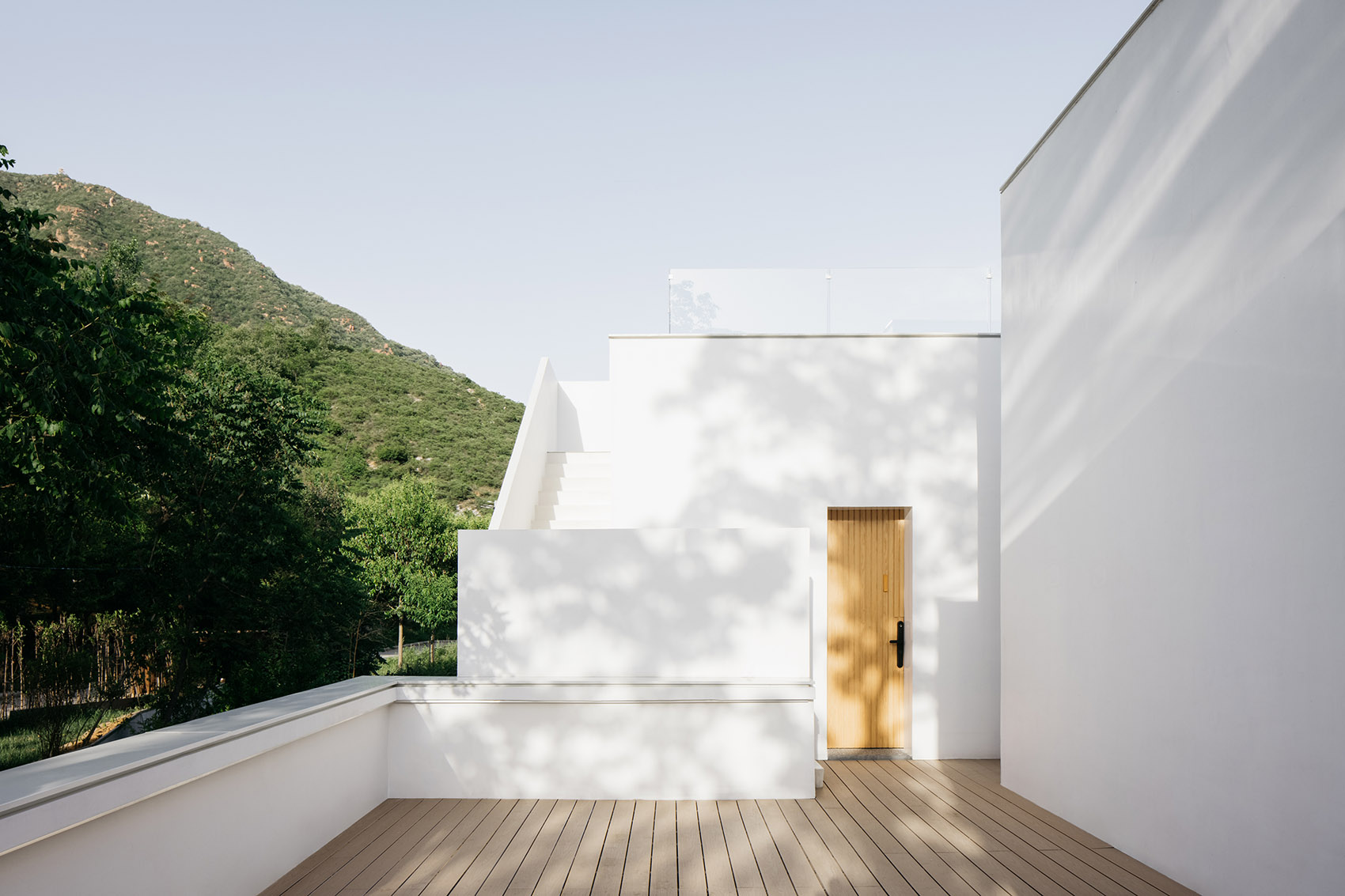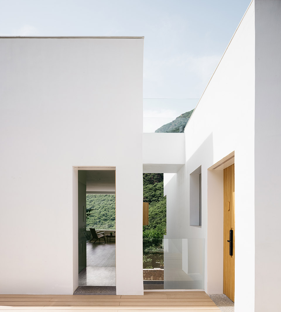 體塊之間的進退變化,使室內看到不同方向的山景。登上屋頂平臺,不遠的群山亦像在俯身對望,建筑與自然的對話在山谷間娓娓道來,“我見青山多嫵媚,料青山見我亦如是”。