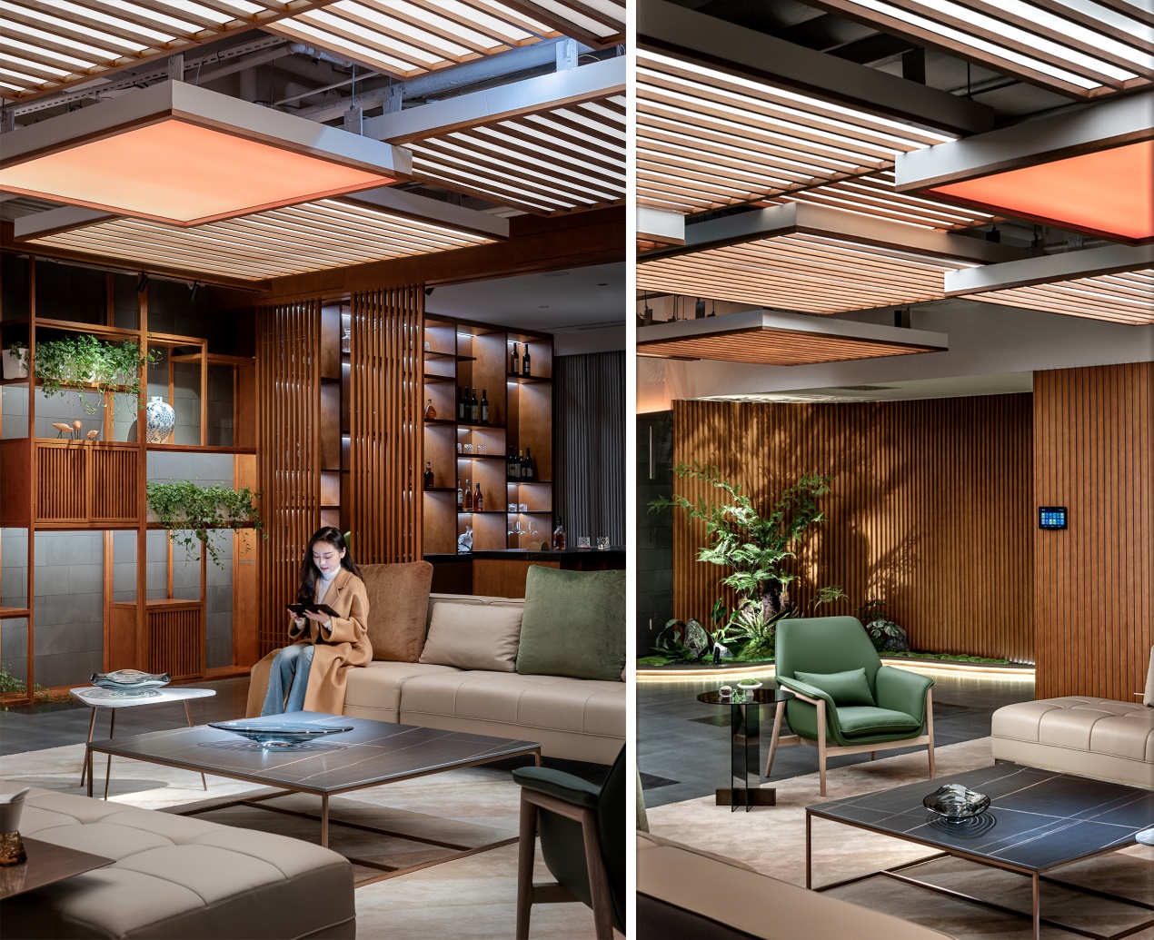 進門處通道采用天然石材與木格柵結合,墻面嵌入呼吸燈,地腳的流水燈帶,延續至大廳,燈光追隨著步伐緩緩亮起,宛如穿插在叢林中照射出的一道道螢火光束。在進門處設計了園林造景,帶人走進了叢林般,感受自然的心聲。