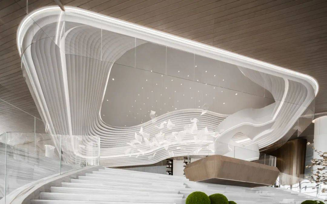 設計師對變化無窮的自然現象的癡迷轉譯成了設計的一部分,海水跟隨潮汐的起落呈現出不同的形態,空間亦是如此。點點星光投射在形狀各異的天花裝置上,靈動而富有生機,層層曲線自由流淌在天花之上,與地面的那一抹藍呼應。