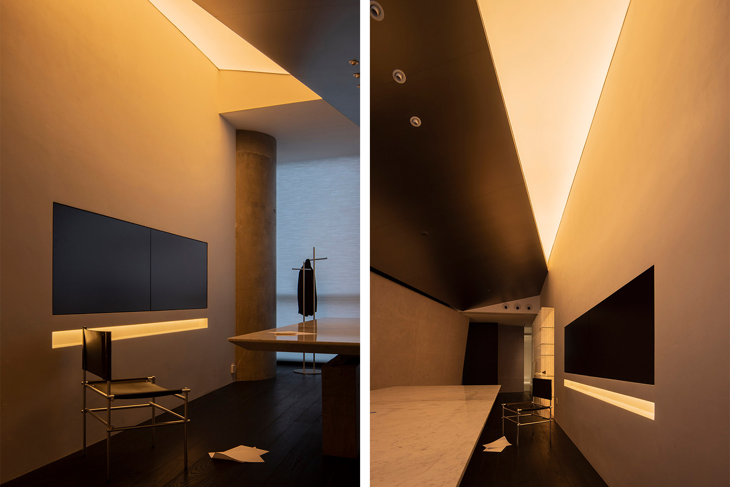 在空間構造上,通過在空間中構建三道清水混凝土墻體,在原建筑和墻體之間營造出新的場域。入口的斜墻是一種退讓的姿態,也是功能的需求和視覺的引導;玄關的墻體起到對辦公區的遮擋作用,也承載了儲物的功能需求;中間最長的一道斜墻巧妙地構建出會客區和辦公區兩個主要的功能空間,墻體的斜切為空間帶來了強烈的視覺感官。
