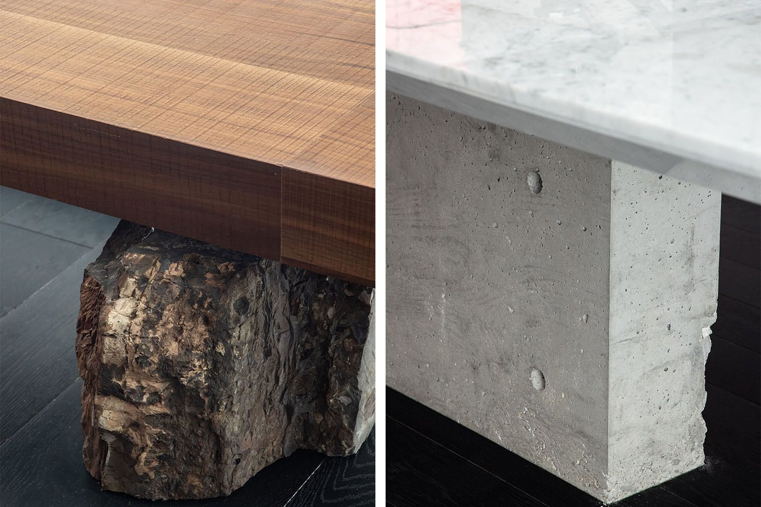 整個辦公空間的基調是理性顏色,帶著冷靜的思考,同時可以迸發思想性與活躍性,激發感性的領悟。墻面的清水混凝土、黑色的木地板、天花的金屬板作為空間的主基調,石頭、木飾面、玻璃柜與辦公家具適配空間氛圍,營造理性與感性結合的辦公空間。各種材質的互相碰撞,讓空間層次感更加分明。