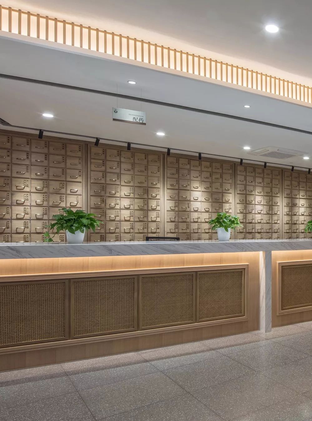 柜臺和存放藥材的百子柜,往往是一個醫館的核心,在本次設計中依然保留了傳統的醫館模式,貝聯珠貫的小抽屜呈現嚴謹的秩序感,在燈光下熠熠生輝。