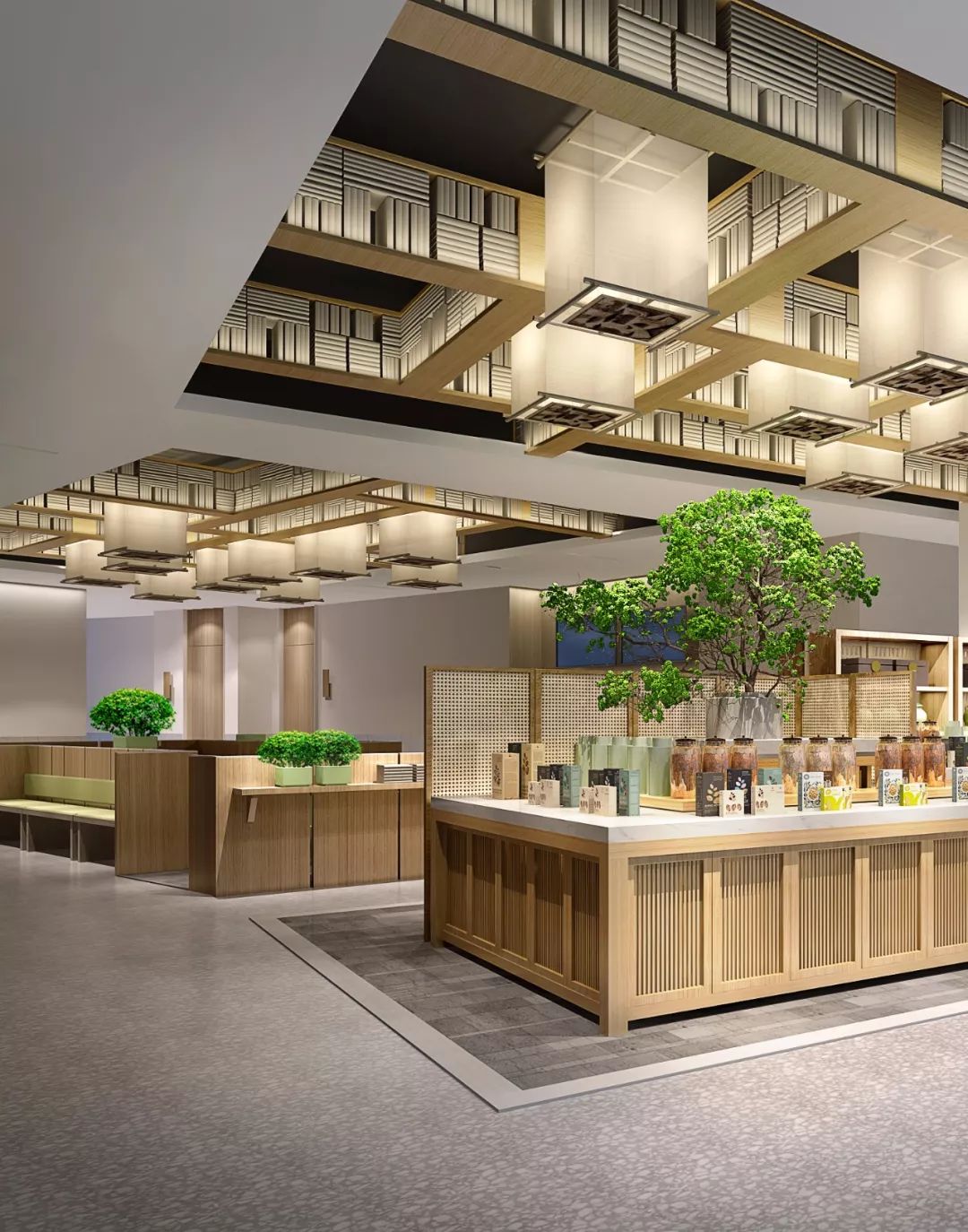 吊頂上燈飾錯落,更顯視野開闊空氣流動,窗明幾凈,不需要太多的神秘感,顯得更加開放自然。實木和透光材質的吊燈凸顯古風,但又滿足現代照明需求,傳遞了現代美學與傳統工藝有機碰撞。