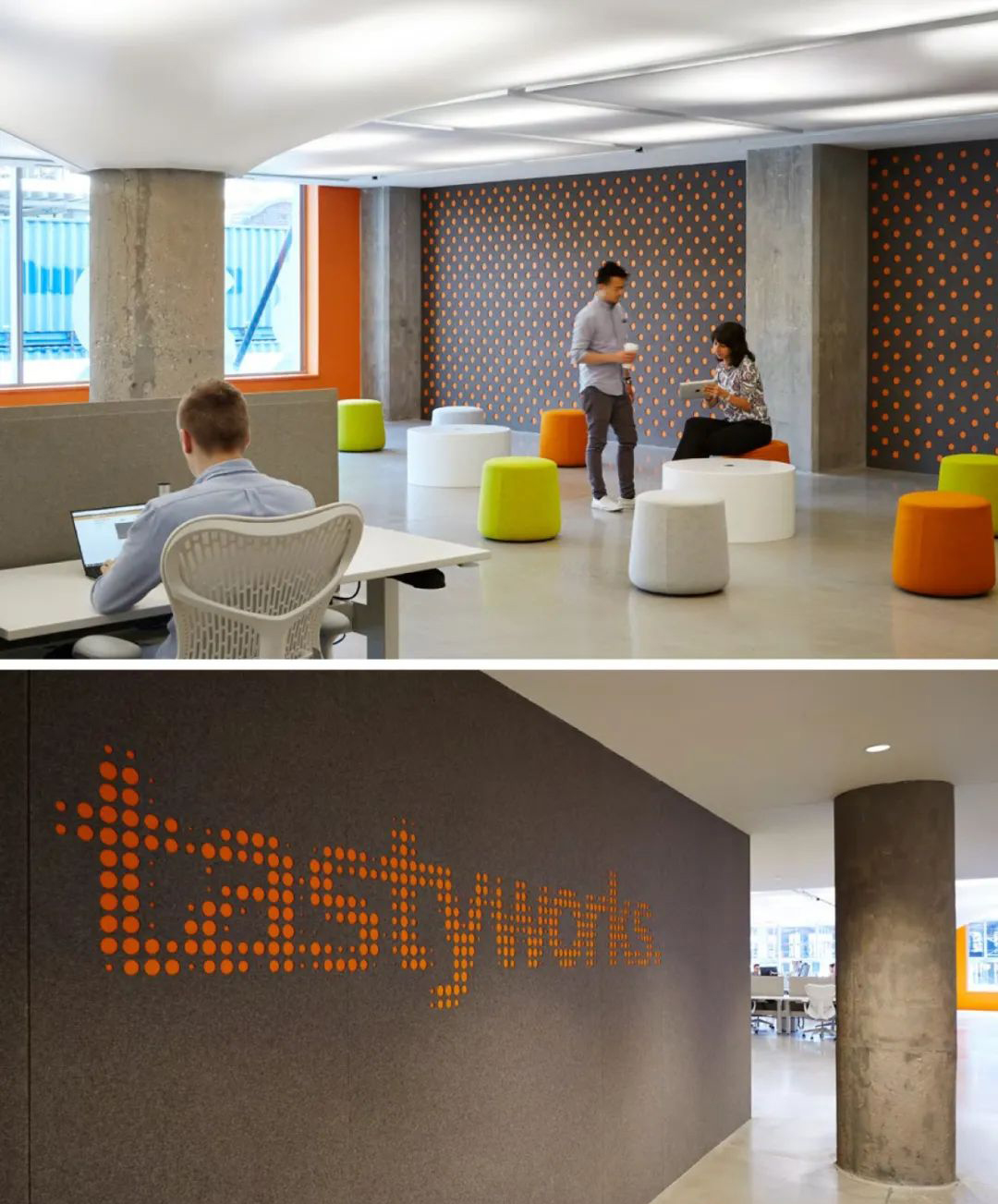 網絡證券公司Tastyworks的芝加哥辦公室,是一棟冷庫改建的辦公大樓。接待區的Logo 墻面,設計選用了Filzfelt棕色的200和橙色的151色號羊毛毛氈,雙層疊加后在表層飾面精確鏤空,將Tasty Works公司的logo通過底層明亮的橙色毛氈透出,克制而不張揚。