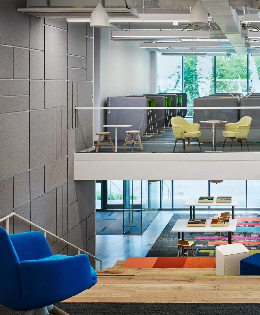 地毯品牌Interface在亞特蘭大的總部,Perkins+Will選擇了靜謐灰作為Logo墻主色調,并選擇了Filzfelt的Akustika 10 Wall墻面吸聲系統,降噪系數高達0.75.